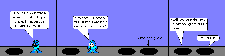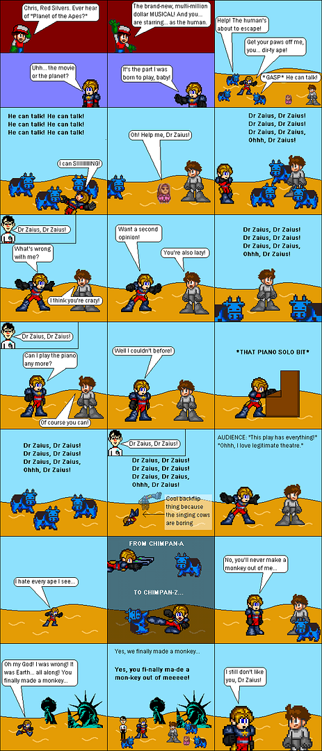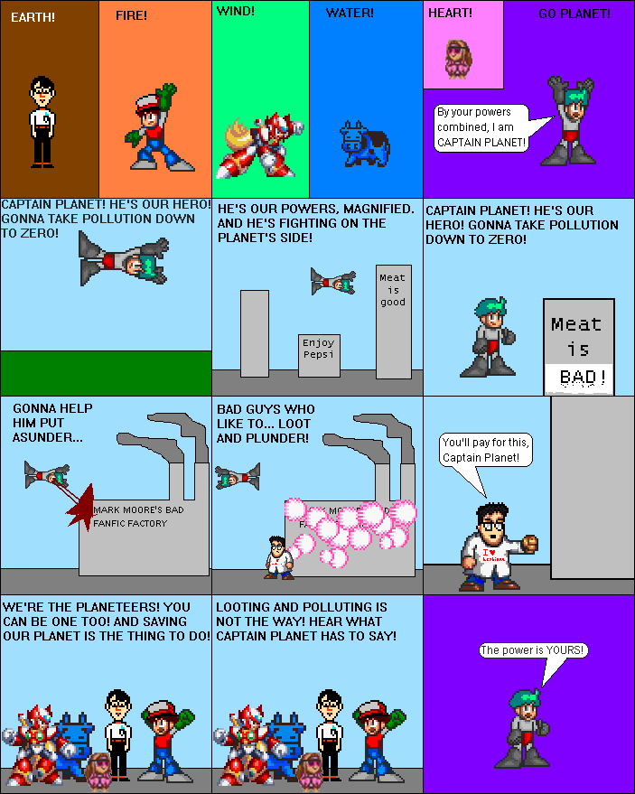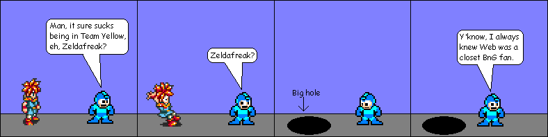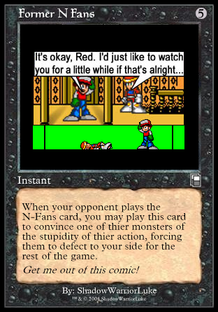Yeah, they managed to survive the transition to my new computer. Might still be on my Photobucket too actually. I'll see if I can dig them up. EDIT (and I apologise for anything disrespectful to Web in advance, though I don't think I did a whole lot of that): Team Yellow complaining about being in the back burner all the time. Team Yellow both end up in the hole. Alternate way of Team Yellow both ending up in the hole. P-chan reads one of the worse parts of his manga and pulls a Mechamage. N-Fans Captain Planet MTG card. (note that I've never played MTG so if I got that card wrong I apologise) N-Fans Dr Zaius P-chan visits CSNES forums. An N-Fans kinda Christmas Tales from a Parallel Universe: N-Fans style Man I must have been bored back then... |