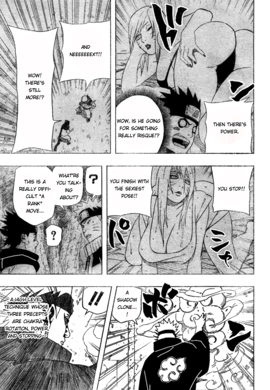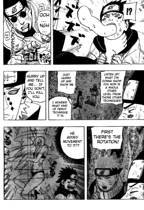 Pain is chasing Konohamaru. Konohamaru backs up against a wall accidentally, which lets Pain grab him by the throat. Ebisu tries to save him, but gets kicked away. Pain's demon appears behind him and Pain asks whether Naruto is in the village or not. Konohamaru responds with I don't know. His soul is dragged out of his mouth and Pain demands he tell him seriously. Konohamaru remembers Naruto teaching him a new move. It's hard for me to talk about, cause Konohamaru keeps thinking pervy thoughts, so let me show you. http://img.photobucket.com/albums/v73/PriestMan/04.png http://img.photobucket.com/albums/v73/PriestMan/05.png Anyways, the new move Naruto taught Konohamaru is Rasengan. It's not very big, but it's surprising he can actually use it. Pain is nailed by the Rasengan and seems to be knocked out. Pain is now talking to Tsunade. She remembers him from the past as a child. He then demands for Naruto Uzumaki. Tsunade ain't saying. Pain then starts to talk about his previous captures. He says the war is about to start and Akatsuki will control it. If Tsunade helps him he says he'll help them out. She then lashes out at him, telling him he's nothing more than a bunch of terrorists destroying the peace. Pain tells her to stop and sends a wave of chakra out. The other ninja fall back. Pain mentions that it's the peace that results in violence. Tsunade still won't have it and Pain gives her one last warning from god. He asks for Naruto, but she tells him it's not about hiding Naruto or protecting him forever. Naruto is strong. I'll sum this next part up quick: The Crypto team is still talking about Pain. They figured out the chakra receivers make the dead bodies move. Someone has to be controlling the dead bodies with chakra. This leads them to FINALLY figure out the code "There is no real one". They also figure whoever is controlling the bodies must be in Konoha still. Just as they go to search, one of Pain's bodies jumps in. He grabs Shizune's head and threatens to kill her if they make any moves. He starts reading her mind and finds out where Naruto is at. |