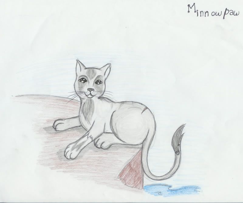RiverClan: Name: Minnowpool Gender: She-cat Clan: Riverclan Age in moons: 20 moons Picture: Minnow Position: Queen (Her kits) Apprerance: Minnowpaw has very deep, very bright black eyes, that look like stars in a night sky, and has a silver gray pelt with unique markings. The first set of markings starts at her chest, and it looks like the tail of a fish, under her eyes there are two more black markings that look like the fins of a fish and on her forehead fanning back it looks like the head of a fish, which gave her the name Minnowkit when she was little, latter to Minnowpaw. She has one white paw, with a little black marking on it, and a gray tail but at the end of it it's white, and has a little black marking that looks like a fish with a little white spot that looks like it's eye. Her tail is abnormally long and she has rather large paws and eyes, that make her look clumsy. she can dodge rather fast in paw to paw combat, but when it comes to running, she's slow and clumsy in a way, compared to most apprentances, because of her paws. Personality: Minnowpaw is very bright and bubbly, and even if she's not a good hunter or runner, she's very possitive that she'll find a skill she's good at. She doesn't like not being able to do things to help the clan, so she always tries something new. In Character Writing Sample: Minnowpaw looked down at the water, and her tail flicked back and forth behind her, like the tail of a jaguar about to fish. Her bright eyes stared at the fish glittering in the water, and gently, she dipped the tip of her tail down. It was a tecnique she learned long ago, one she didn't share with her fellowfishercats, because she didn't think they would approve. but she used it anyway. Down went her tail, and the little black marking flicked out of the water, just like a fish leaping to kiss the sky. And out followed another fish, one that her paw met very neatly and brought to the shore, killing it swiftly with a small bite. She repeated this, gathering a small pile of fish, until she stopped so she could return the fishes back to her clan. She loved fishing, because unlike hunting, it was something she was better at than most. Her bright eyes were full of silent pride as she carried the very full mouth of fish home, and her tail swished behind her. Walking throught her river reads, the examined the scents she found, just in cast. There was the faint taint of Riverclan cats, and she couldn't pick out the individuals just yet. She didn't really have many friends here, and her littermates didn't seem to like her very much. She was a sky kit, who didn't really like to play like the others... With a little sigh, she wondered if she could find a way for her bumbling-pawed self to fit in... Maybe if I bring home enough fish, I can prove I'm a good Clancat... She thought, and hurried home, carrying her load to show her mentor. Other: Mate of Graytail ~~~ Name: Stormfur Gender: Tom Clan: RiverClan Age: 30 Moons Picture: Pic Appearance: Large gray tom, white patch on chest and chin, strange orange-ish eyes. Personality: Loyal and kind most of the time, but when he's angered..... Codeword: Cow Bell Position: Warrior ~~~ Name:Nightstorm Gender: tom Clan:RiverClan Picture: Pic Apprerance: Pretty much the picute only with out the phone Personality:Strong willed and firce in battle Other: Moonshimmer's mate and father of ALL her kits. Codeword: Cow Bell Position: Warrior ~~~ Name: Echokit Info: Here Other: Unborn brother of Foxkit, Cliffkit, Featherkit and Ghostkit. Son of Graytail and Minnowpool. Evil follower of Foxkit [<-- later] ~Pichu ~~~ Name: Smokefoot Gender: She-cat Clan: RiverClan Age in moons: 15 moons Picture: Apprerance: Dark gray with yellow eyes Personality: Sneaky like her father In Character Writing Sample: Only needs to be done once. Other: Daughter of Ebonypool and Tallshadow Postion: Apprentice ~~~ Name:Flyingclaw Gender: She-cat Clan: RiverClan Age: 24 Apperance: Golden-brown she-cat with white paws and amber eyes. Personality: She likes to jump and climb, hence 'Flying' Other: Daughter of Sunstream. Sister of Arcticwhisker, Howlingwolf, Jaggedfang, Copperstreak and Indigobreeze ~~~ Kit's Name: Hazelstorm Kit's Gender: She-cat Kit's Clan: RiverClan Kit's Picture: Pic Other: Daughter of Moonshimmer and Nightstorm. Littermate of Coalfang, Minnowflower, Sparrowheart and Silvershadow. Sister of Icekit, Fawnkit, Ravenkit, Lunarkit, Riverdapple, Strawberryleaf and Wolfstep ~~~ Kit's Name: Strawberryleaf Kit's Gender: She-cat Kit's Clan: RiverClan Kit's Picture: Pic Other: Daughter of Moonshimmer and Nightstorm. Littermate of Strawberryleaf and Wolfstep. Sister of Hazelstorm, Coalfang, Minnowflower, Sparrowheart and Silvershadow, Icekit, Fawnkit, Ravenkit and Lunarkit ~~~ Kit's Name: Current-tail Kit's Gender: Tom Kit's Clan: RiverClan Other: Third born Kit's Picture: Pic Other: Son of Stripedfoot and Icetail. Brother/littermate of Torrentfang and Rapidclaw ~Mist ~~~ Kit's Name: Cedarkit Kit's Gender: Tom Kit's Clan: RiverClan Other: Son of Frosty and Thistlefeather. Brother of Hawkkit, Jasminekit and Birchkit. Half brother of Specklekit, Frostkit, Leopardkit, Firekit, Lavakit, Silverkit, Autumnkit, Volekit, Dustkit, Coalkit, Snowkit, Maplekit, Weaselkit and Skykit Kit's Picture: pic |