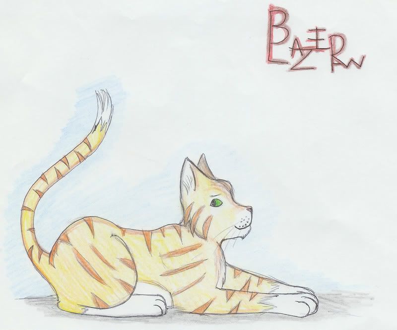ThunderClan: Name: Blazeheart Gender: Tom Clan: Thunderclan Age in moons: 24 Picture: Pic Apprerance: Blazepaw is a yellow tabby with white paws, a white tipped tail and green eyes. He is average sized, and looks like trouble. Personality: Blazepaw is sneaky and protective of his denmates, and seems to get into trouble all the time. But he's really sweet at heart, and will always help one of his denmates in need. But he doesn't like to be pusehd around. That'll just make him angry. Other: Mate of Minnowpool [used her]. Father of Foxkit and possibly Echokit. It's complicated! Position: Warrior ~~~ Name: Dawnbreeze Age: 20 moons Clan: Thunderclan Apperance: Light ginger with light green eyes Personality: She's fun loving, and explorative, but alot calmer than her sister, and more sweet and kind. Picture: Pic Didn't draw this one. Other: ~~~ Name: Duskfern Gender: She-cat Age: Same as Thundercloud Appearnce: Light ginger tabby with green eyes. Personality: She's outgoing and could easily match Thundercloud in a match of wills. Other: She's Thundercloud's best friend. Hates Hedgelily ~Mist ~~~ Kit's Name: Breezekit -> Breezepaw -> Breezeclaw Kit's Gender: She-cat Other: Tawny with dark brown stripes and some calico with blue eyes Daughter of Northclaw and Russetmask. Sister of Runningshadow, Tornclaw, Paleflower and Fallingheart Kit's Picture: Pic |