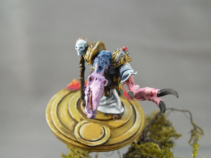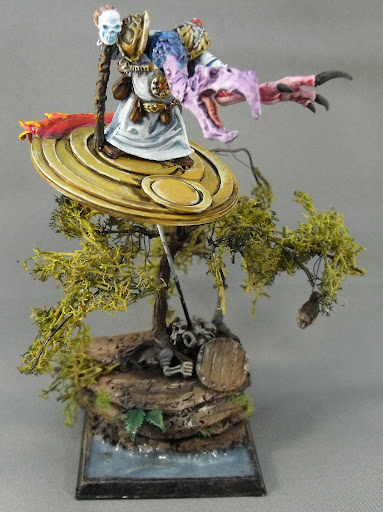 My Tzeentch sorcerer Posted Image Posted Image he started life as a '97 sorcerer in the bottom of my bits box. I'd lost his head and arm so he had a lord of change head and the arm from a spawn. the disk is plasticard with green stuff flames and the rocks are cork tile with bits from the warhammer basing kit. the tree is made from twisted wire. |