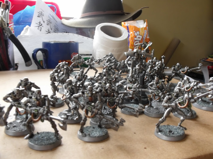 for a quick paint job, go the army painter route. Plate mail metal spray over anything with armour and human flesh for anything that has bare skin. Sprays. Then pick out anything that doesn't work in the base colour like marauder weapons or hair. follow that with a dip of Strong tone shake off the excess and leave to dry. To finish up add a spray of anti shine matt varnish if you want. base them and you will have an attractive and quick army. Posted Image a not very good photo of some necrons i painted using this method for a freind, 1750pts in about 3 hours not including drying time. |